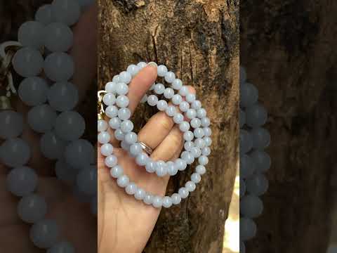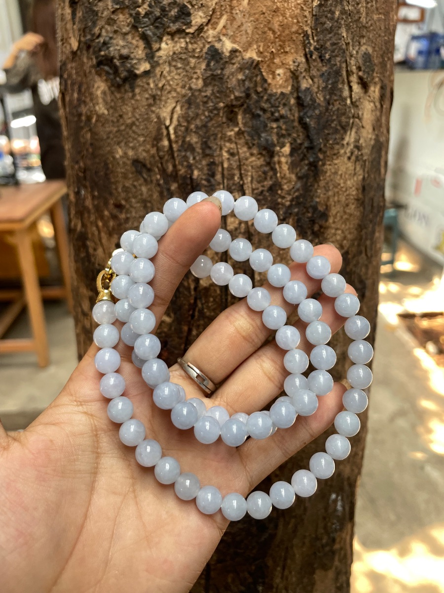This elegant necklace features a long strand of perfectly round jade beads in a soft, delicate lavender hue with excellent translucency. Each bead is meticulously polished to a smooth, glossy finish, showcasing the stone's natural clarity and uniform color. The generous length allows it to be worn in multiple ways—singly, doubled, or layered—offering versatile styling options. It is finished with a simple yet elegant gold clasp, adding a touch of classic luxury. A timeless piece that embodies purity, grace, and the unique beauty of lavender jade.
