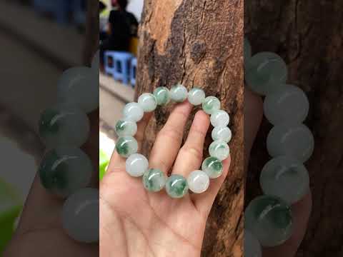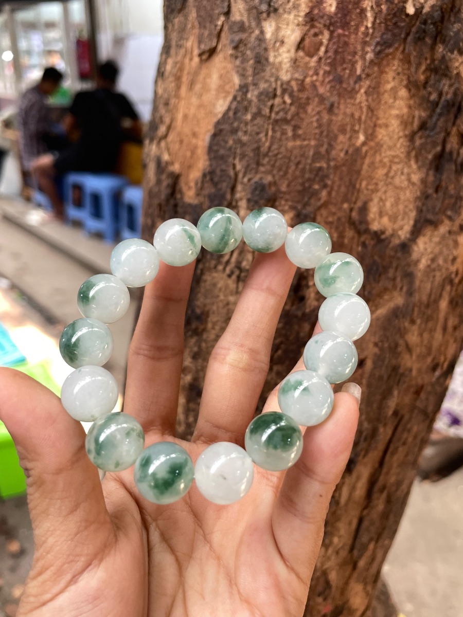 This stunning bracelet features large, perfectly round jade beads in a classic combination of translucent white base with vibrant green patches or "floating flowers". The green inclusions are naturally distributed, creating unique and artistic patterns on each bead. The stones have a smooth, polished surface and excellent translucency, giving them a soft, luminous appearance. The substantial size of the beads makes this piece bold yet elegant, perfect for making a stylish statement while enjoying the natural beauty of jade.