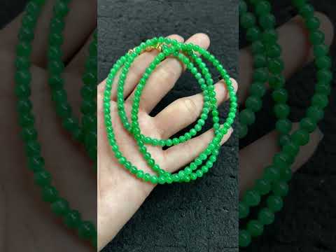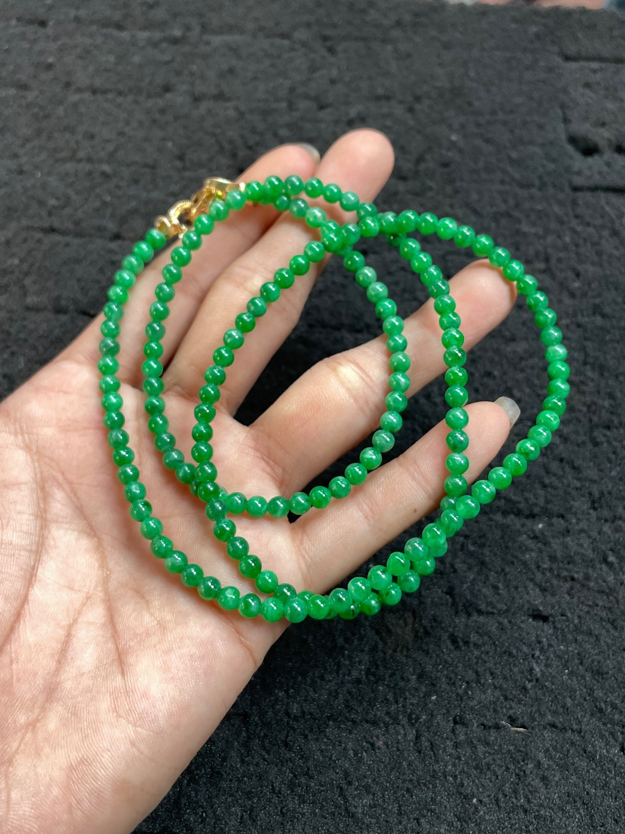 This exquisite necklace features tiny, perfectly round jade beads in a rich, saturated green color often referred to as "imperial green". The stones are uniformly sized and colored, with a smooth, polished surface and good translucency that enhances their vibrant hue. Strung together in a long, delicate strand and finished with an elegant gold clasp, this piece is lightweight and versatile, perfect for wearing alone as a subtle pop of color or layered with other jewelry for a more luxurious look.