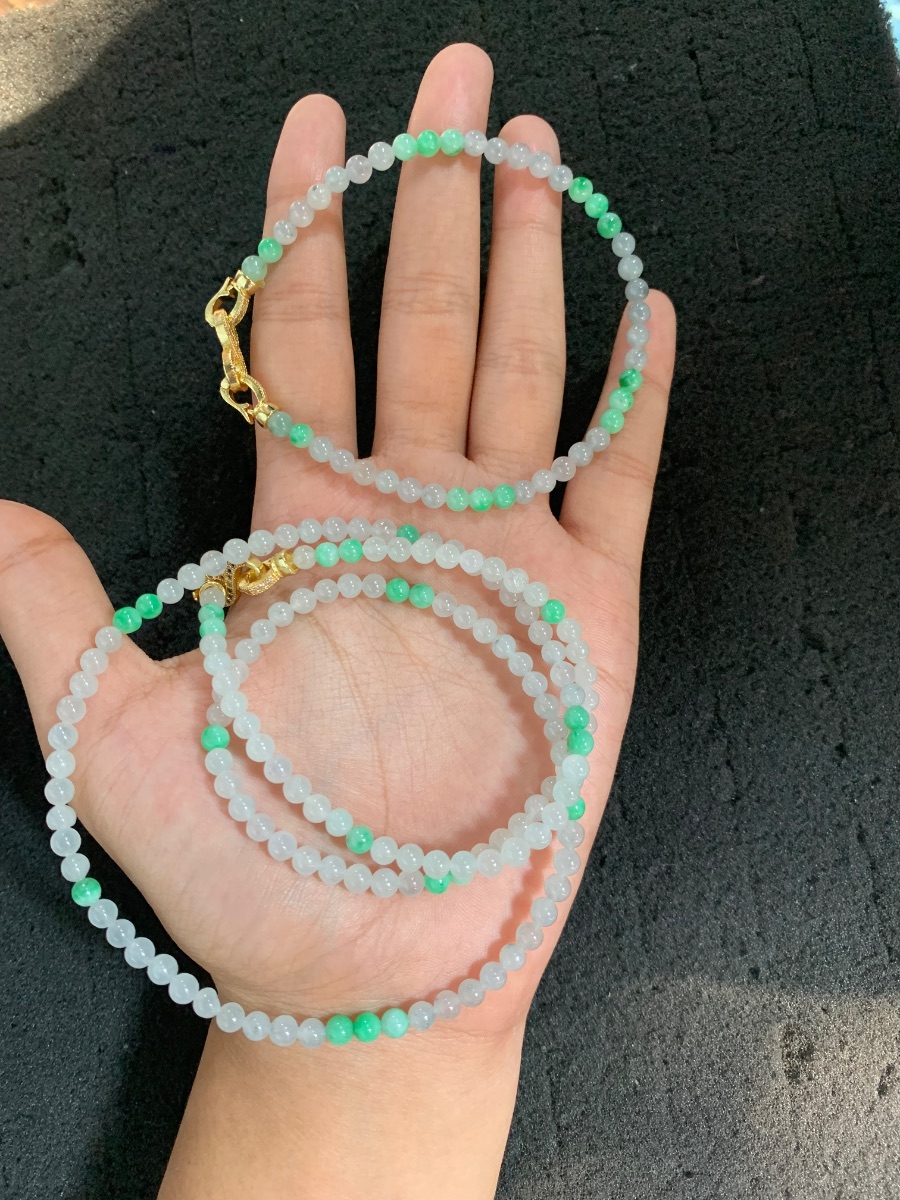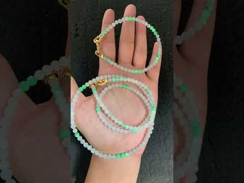 This exquisite necklace features tiny, perfectly round jade beads in a stunning combination of icy white and vibrant green. The majority of the beads are highly translucent with a cool, glass-like luster, while the bright green accents are strategically placed throughout the strand, creating a beautiful and refreshing color contrast. Each bead is meticulously polished to a smooth, glossy finish, showcasing the natural beauty and high quality of the stone. The necklace is finished with an ornate gold-toned clasp and decorative elements that add a touch of luxury and warmth. The delicate size of the beads gives the piece a lightweight and graceful appearance, making it a timeless and versatile accessory that can be worn alone or layered for a more elaborate look.