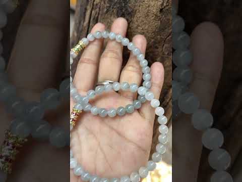 This elegant necklace features perfectly round jade beads in a pure icy white base color, beautifully adorned with natural grey floating patterns. The stones are highly translucent with a smooth, glossy finish, exhibiting exceptional clarity and a bright natural glow. Each bead is uniformly sized and polished, showcasing the fine texture and the unique, artistic patterns that add depth and character. The strand is accented with ornate gold-toned spacers decorated with colorful stones, adding a touch of luxury and contrast. It is a versatile piece that can be worn as a single long necklace or wrapped multiple times as a bracelet, offering a classic and timeless style.