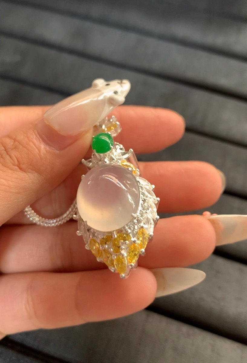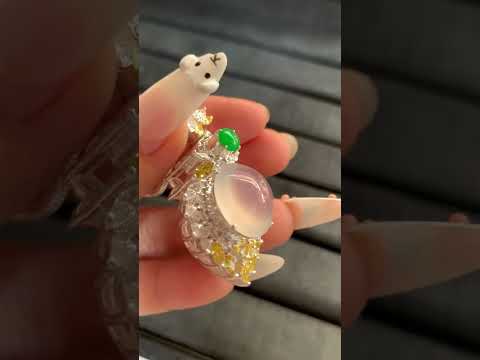 This charming pendant features a large, oval jade cabochon of exceptional transparency, appearing like pure ice with a soft lavender hue and a bright natural glow. At the top sits a small, vibrant green jade accent, while the entire piece is surrounded by an intricate silver-toned setting adorned with sparkling clear and yellow stones arranged in a floral or leaf-like pattern. The design is uniquely topped with a cute, detailed rat figure, adding a touch of whimsy and symbolism. The combination of the high-quality jade, colorful accents, and fine craftsmanship makes this pendant a truly unique and eye-catching piece of jewelry.